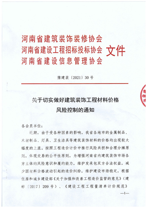 關(guān)于切實做好建筑裝飾工程材料價格風(fēng)險控制的通知