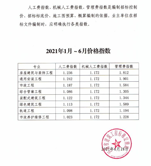 河南省建筑工程標(biāo)準(zhǔn)定額站關(guān)于發(fā)布2021年1~6月人工費(fèi)、機(jī)械人工費(fèi)、管理費(fèi)指數(shù)的通知