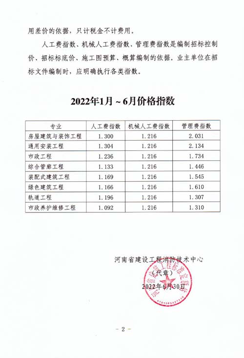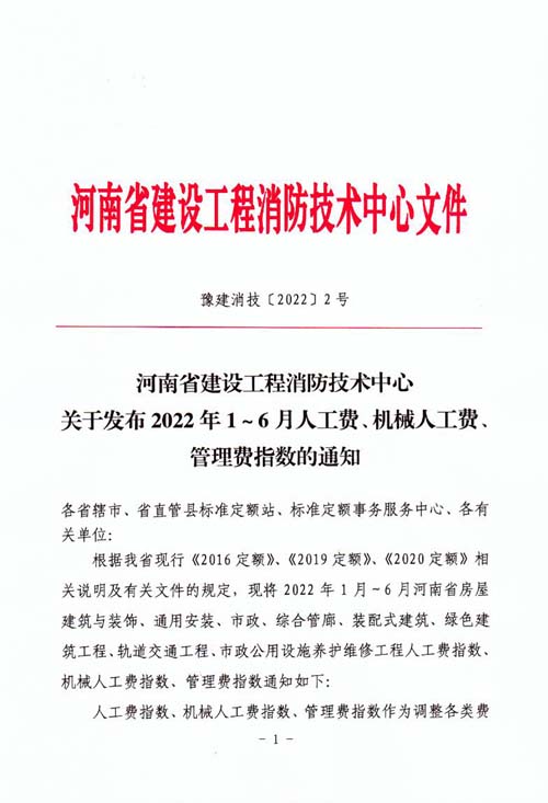 河南省建設(shè)工程消防技術(shù)中心關(guān)于發(fā)布2022年1~6月人工費(fèi)、機(jī)械人工費(fèi)、管理費(fèi)指數(shù)的通知。