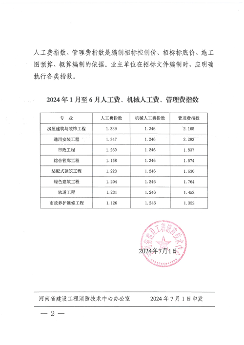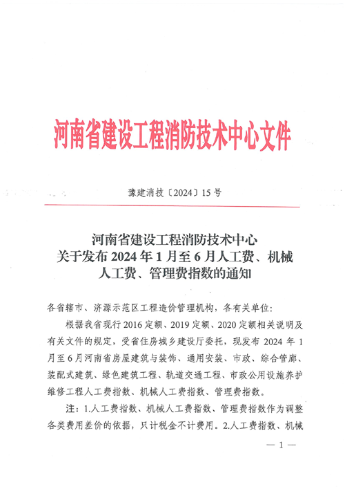 河南省建設(shè)工程消防技術(shù)中心關(guān)于發(fā)布2024年1月至6月人工費、機(jī)械人工費、管理費指數(shù)的通知