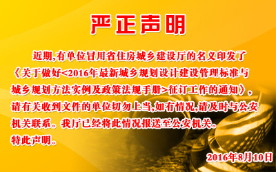 近期,有單位冒用省住房城鄉(xiāng)建設廳的名義印發(fā)了《關于做好<2016年最新城鄉(xiāng)規(guī)劃設計建設管理標準與城鄉(xiāng)規(guī)劃方法實例及政策法規(guī)手冊>征訂工作的通知》,請有關收到文件的單位切勿上當,如有情況,請及時與公安機關聯(lián)系。我廳已經將此情況報送至公安機關。