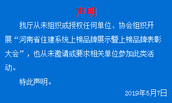 我廳從未組織或授權(quán)任何單位、協(xié)會(huì)組織開展“河南省住建系統(tǒng)上榜品牌展示暨上榜品牌表彰大會(huì)”,也從未邀請(qǐng)或要求相關(guān)單位參加此類活動(dòng)。