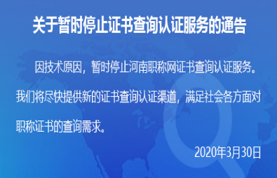 因技術(shù)原因,暫時(shí)停止河南職稱網(wǎng)證書查詢認(rèn)證服務(wù)。我們將盡快提供新的證書查詢認(rèn)證渠道,滿足社會(huì)各方面對職稱證書的查詢需求。