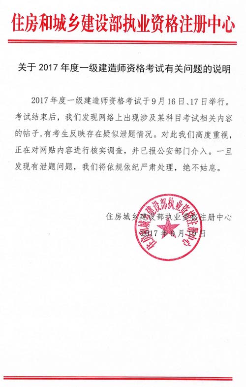 2017年度一級(jí)建造師資格考試于9月16日、17日舉行??荚嚱Y(jié)束后,我們發(fā)現(xiàn)網(wǎng)絡(luò)上出現(xiàn)涉及某科目考試相關(guān)內(nèi)容的帖子,有考生反映存在疑似泄題情況。對(duì)此我們高度重視,正在對(duì)網(wǎng)貼內(nèi)容進(jìn)行核實(shí)調(diào)查,并已報(bào)公安部門介入。一旦發(fā)現(xiàn)有泄題問題,我們將依規(guī)依紀(jì)嚴(yán)肅處理,絕不姑息。