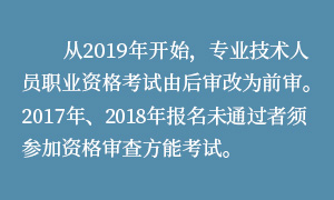 從2019年開始,專業(yè)技術人員職業(yè)資格考試由后審改為前審。2017年、2018年報 名未通過者須參加資格審查方能考試。