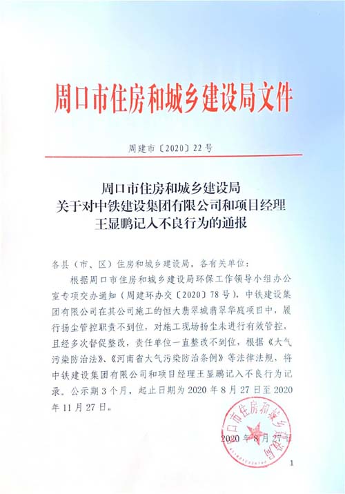 - 關(guān)于對(duì)中鐵建設(shè)集團(tuán)有限公司和項(xiàng)目經(jīng)理王顯鵬記入不良行為的通報(bào)
