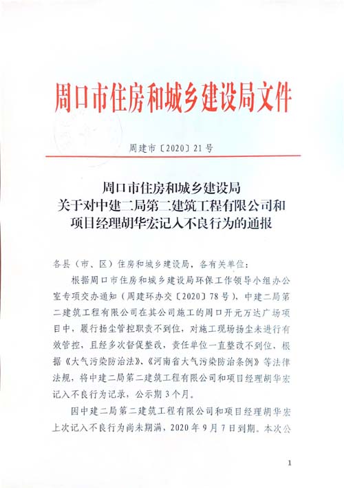 關(guān)于對中建二局第二建筑工程有限公司和項目經(jīng)理胡華宏不良行為的通報