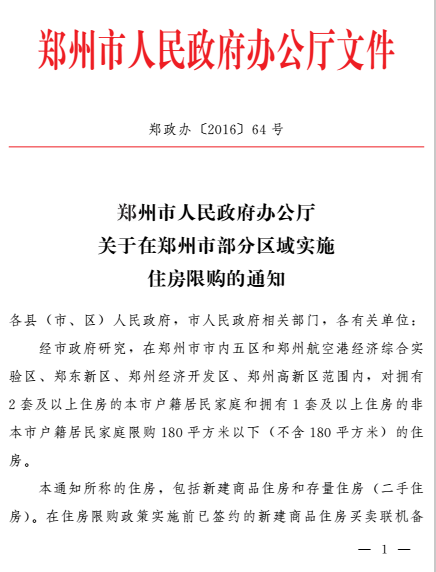 鄭州市人民政府辦公廳10月1日發(fā)出在鄭州市部分區(qū)域?qū)嵤┳》肯拶彽耐ㄖ?。鄭政辦[2016]64號關(guān)于在鄭州市部分區(qū)域?qū)嵤┳》肯拶彽耐ㄖ?/p>