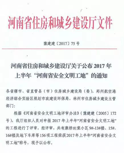 河南省住房和城鄉(xiāng)建設(shè)廳關(guān)于公布2017年上半年河南省安全文明工地的通知。 豫建建〔2017〕75號(hào)。根據(jù)《河南省安全文明工地評(píng)審辦法》,我廳組織人員對(duì)申報(bào)2017年上半年河南省安全文明工地的工程進(jìn)行了評(píng)審,經(jīng)評(píng)審,共計(jì)有156項(xiàng)工程榮獲2017年上半年河南省安全文明工地的稱號(hào)。