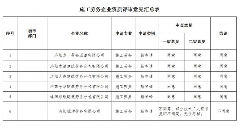 根據(jù)《建筑業(yè)企業(yè)資質(zhì)管理規(guī)定》(建設部令第22號)、《建筑業(yè)企業(yè)資質(zhì)標準》(建市[2014]159號)和《建筑業(yè)企業(yè)資質(zhì)管理規(guī)定和資質(zhì)標準實施意見》(建市[2015]20號)等有關(guān)規(guī)定,我委對受理的施工勞務企業(yè)資質(zhì)申報材料進行了審查,現(xiàn)將審查意見在洛陽城建信息網(wǎng)(http://www.lycj.gov.cn/)予以公示。